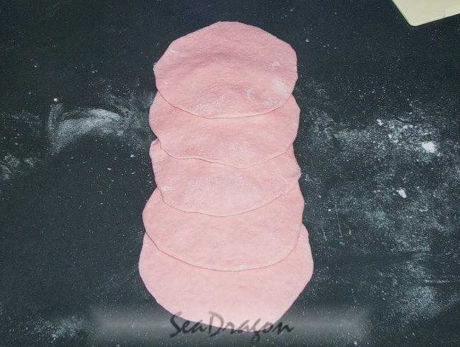 5. Roll out each ball with a small rolling pin into a thin round sheet about 8cm in diameter, with the centre slightly thicker than the edges if possible. Working with 5 sheets at a time, place the first sheet nearest to you on the working surface, place the next sheet on top of the first sheet but slightly further away from you so that it covers about half of the first sheet. Repeat lining up the next three sheets in the same way until you have a row of 5 sheets. Press the sheets together lightly so they stick together.