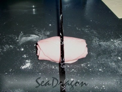 6. Starting from the top sheet, furthest away from you, roll the row of 5 sheets towards you like a Swiss roll. Using a chopstick or a dough scraper, cut the roll in the centre into 2 equal half pieces, using a to-and-fro sawing action. Turn the pieces upright so they resemble rosebuds.