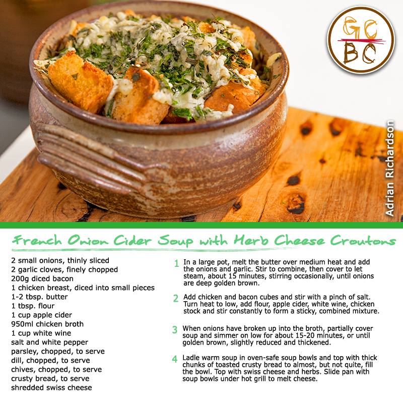French Onion Cider Soup with Herb Cheese Croutons (Adrian Richardson)