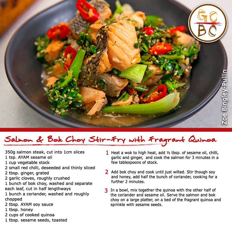 Salmon and Bok Choy Chilli Stir-Fry Served with Fragrant Quinoa (Zoe Bingley-Pullin)