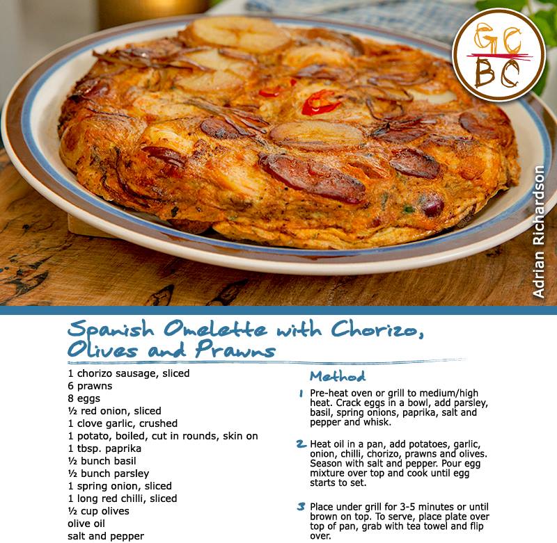 Spanish Omelette with Chorizo, Olives and Prawns (Adrian Richardson)