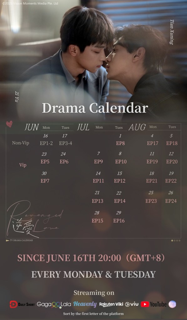 Revenged Love 逆愛 is a 24-episode Chinese BL series that premiered on June 16, 2025, of course for international releases only outside China. It is a remake of the 8-episode Chinese series from 2015, Counter Attack: Falling in Love with a Rival 逆襲之愛上情敵. Both series are adapted from the classic BL novel Counter Attack 逆襲 by Chai Ji Dan 柴雞蛋 who is best known for her other acclaimed BL novel Are You Addicted? 你丫上瘾了 which has been adapted into a few Chinese and Thai versions of web drama in recent years.