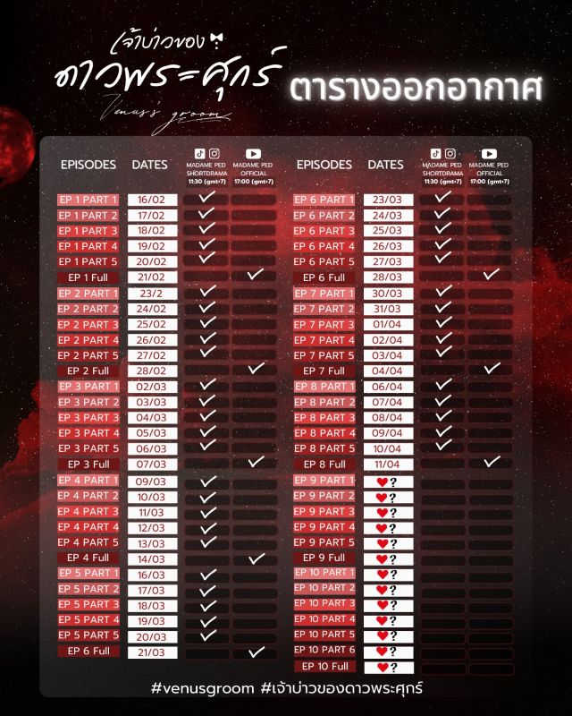Venus’s Groom เจ้าบ่าวของดาวพระศุกร์ is a 51-episode Thai BL short drama that premiered on February 16, 2026 on Instagram and TikTok as a vertical series on the Madame PED OFFICIAL accounts. The series is also re-packaged into ten 10-minute episodes (per five vertical episodes) as a standard wide screen series on Madame PED OFFICIAL YouTube channel starting February 21, 2026. Interestingly, I just discovered that spelling Venus’s with the second “s” after the apostrophe is correct, LOL… I was taught that with names ending in “s”, it is supposed to spell as Venus’ without the second “s”…