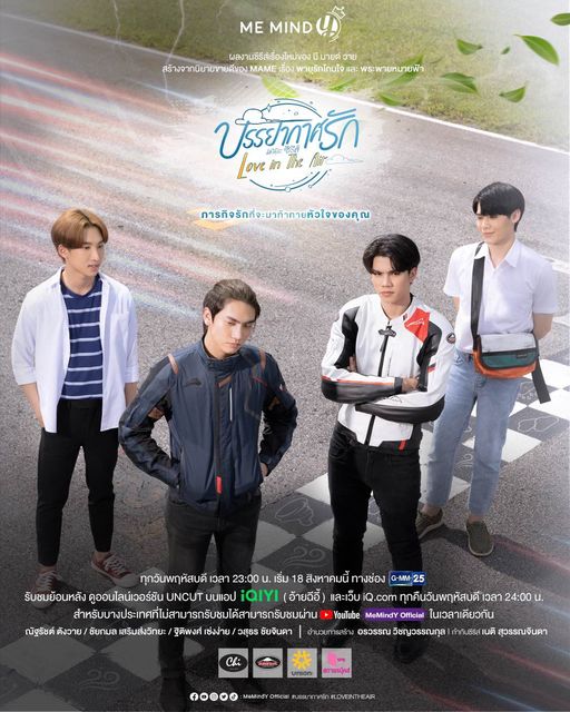 Love in The Air บรรยากาศรัก is a 13-episode Thai BL series that premiered on August 18, 2022. It is adapted from the two novels by MAME, Love Storm พายุรักโถมใจ and Love Sky พระพายหมายฟ้า. MAME’s other books have also been previously adapted into two popular BL TV series, Love by Chance and TharnType. Currently Love in The Air is already getting good ratings of 8.3 on MDL and 8.2 on Douban respectively with just 5 episodes into the broadcast.