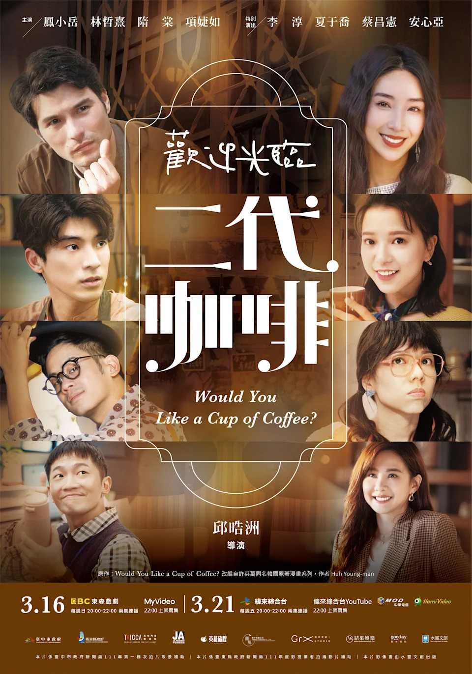 Would You Like a Cup of Coffee? 歡迎光臨 二代咖啡 is a 13-episode Taiwanese drama series that premiered as a special movie edition at the 24th Taipei Film Festival 台北電影節 on July 3, 2022. It took nearly three years but finally it has started airing in Taiwan as a series from March 16, 2025. The series is adapted from the Korean manhwa Would You Like a Cup of Coffee? 커피 한잔 할까요? by Huh Young-Man 허영만 and Lee Ho-Joon 이호준 with illustration by Huh Young-Man 허영만. In 2021, there was also a 12-episode live-action Korean adaptation, Would You Like a Cup of Coffee? 커피 한잔 할까요?